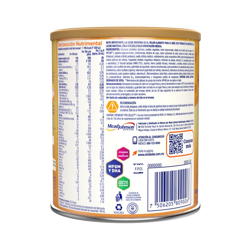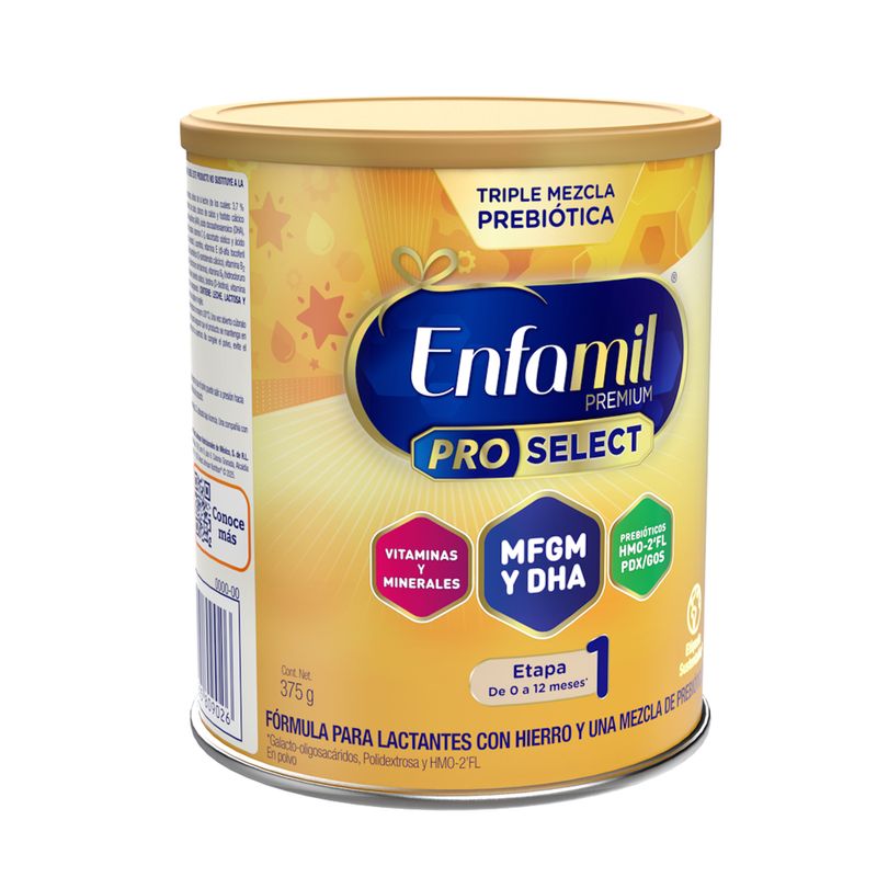 Enfamil Premium Pro Select Etapa 1 de 0 a 12 meses, es una fórmula para lactantes con hierro y una mezcla de prebióticos galactooligosacáridos (GOS), polidextrosa (PDX) y HMO-2'FL.